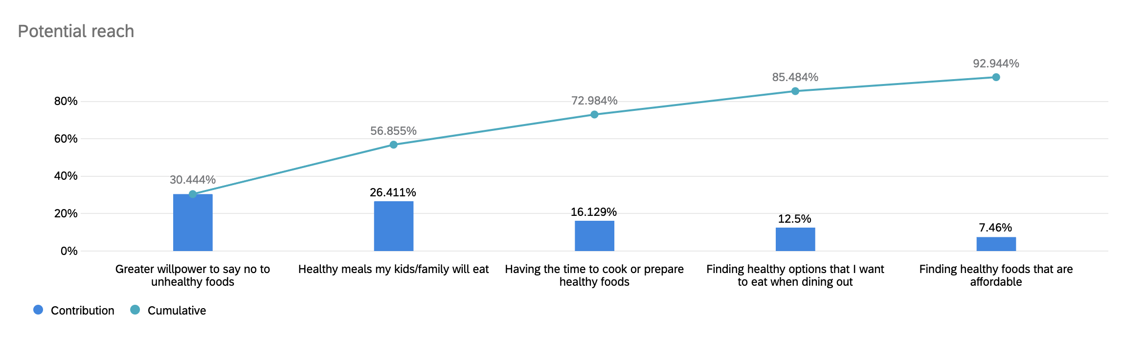 Let’s imagine we’re trying to urge folks to eat healthier. We may have several ideas on how to motivate them, but with MaxDiff, we can pinpoint what people really need to enable them to make healthy choices. In the TURF analysis example above, we can see that the top three factors that will motivate people to eat healthier are: