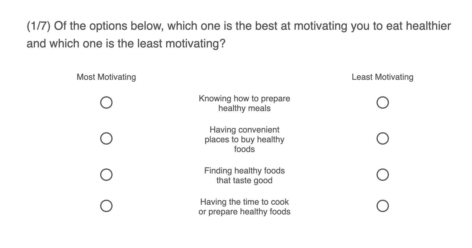 Similar to the advertising example above, we use MaxDiff in public health research to spark positive behavior change. Whether we’re nudging folks to up their exercise game, be kinder souls, or dial down on unhealthy habits like smoking or driving buzzed, MaxDiff is our superhero showing us the way.