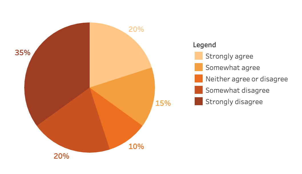 The next example is a bit complicated. It involves ordered data (ranging from strongly agree to strongly disagree), and pie charts are not very suitable for discerning items in a sequential order. Despite having only five categories, it’s already looking a bit crowded. We have to cross-reference the color of the pie slice with the legend, which distracts us from the data and makes us think. A segmented bar chart would be a much better choice here.